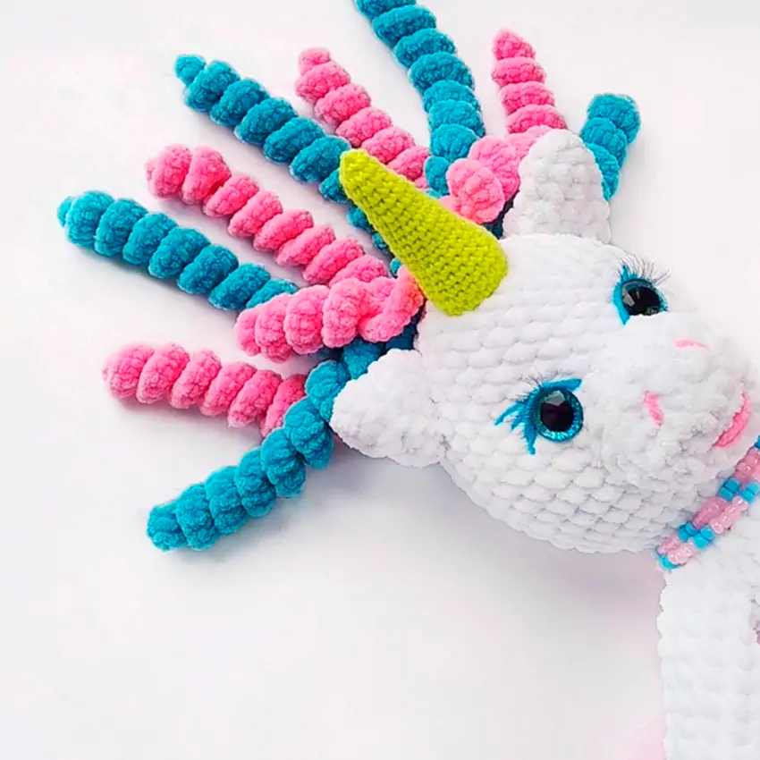 Мастер-класс по вязанию единорога Алисы от Елены Панцыревой. Размер готовой игрушки зависит от используемых материалов: при работе с плюшевой пряжей и плотном вязании столбиками без накида по принципу "галочки" игрушка получается около 30 см в высоту (без учета рога). Если использовать полухлопковую пряжу YarnArt Jeans (50 г/165 м) с крючком 2-2,5 мм, размер единорожки составит 17-18 см. Особое внимание уделяется рогу: для мини-версии его рекомендуется вязать из пряжи Ирис более тонким крючком 1-1,25 мм. В зависимости от выбранного материала меняется не только размер, но и внешний вид игрушки: плюшевый вариант получается более мягким и объемным, а полухлопковый - более изящным и детализированным. Описание включает все этапы работы от туловища до мелких деталей, с особым вниманием к оформлению гривы, хвоста и рога.