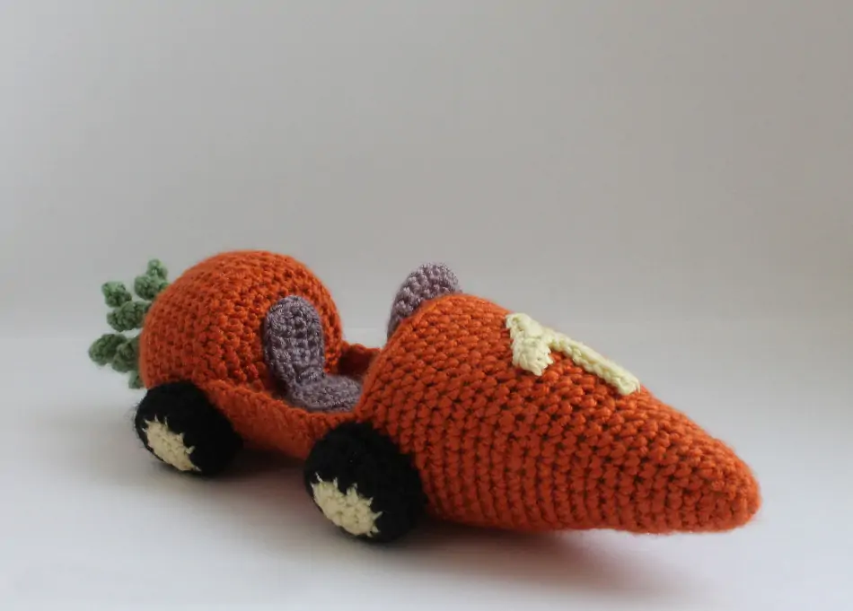 Бесплатный мастер-класс от Марины Чучкаловой по вязанию зайца на морковкомобиле амигуруми крючком. Для работы потребуется пряжа нескольких цветов: оранжевая и зелёная для морковки, чёрная и жёлтая для колёс, белая для зайчика, а также пряжа для шарфика, руля и сиденья. Цвета могут быть выбраны по вашему желанию. Также понадобятся крючок соответствующего размера, наполнитель для игрушек, бусинки или готовые глазки, немного розовых ниток (например, Ирис) для вышивки носика и усиков, а также игла для сшивания деталей.