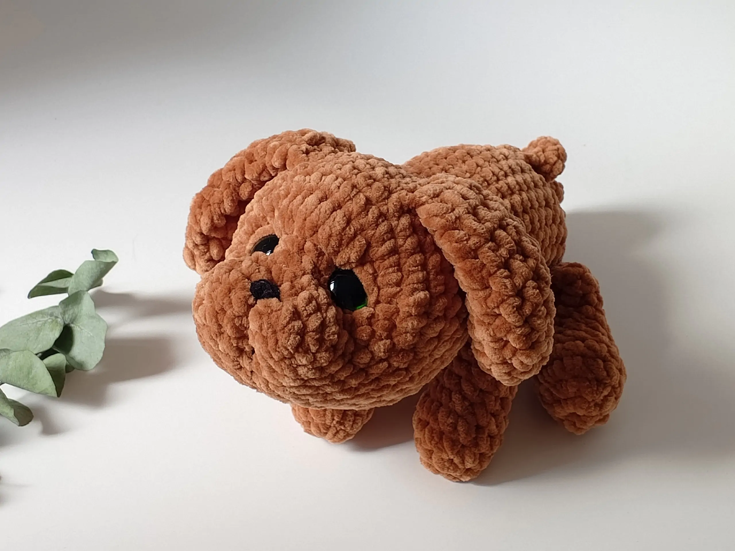 Бесплатный мастер-класс от Дарьи Титовой по вязанию плюшевой собачки-амигуруми Коки крючком. Размер готовой игрушки зависит от выбранной пряжи и плотности вязки. Для работы потребуется мягкая плюшевая пряжа Wolans Bunny Baby (плотность 120м/100г), крючок 4,5 мм и безопасные глазки диаметром 20 мм. Особенность техники — голова и тело вяжутся как единое целое, что обеспечивает аккуратность и прочность основы. Все остальные детали (ушки, лапки, хвостик, мордочка) пришиваются на завершающем этапе.