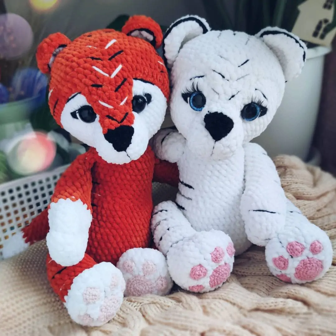 Бесплатный мастер-класс "Полосатики" от Александры Егоровой по вязанию плюшевого тигра амигуруми крючком. Размер готовой игрушки около 33 см. Для работы потребуется: плюшевая пряжа Himalaya Dolphin Baby (оранжевая, белая и черная), крючок 3.5-3.75 мм, пластиковый сустав для головы, наполнитель, игла для сшивания.